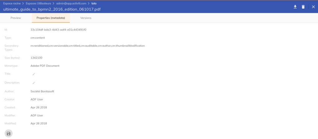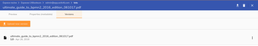 L’onglet détails permet d’afficher toutes les actions relatives au document : la visualisation, l’affichage et l’édition des métadonnées ainsi que les différentes versions de ce document.