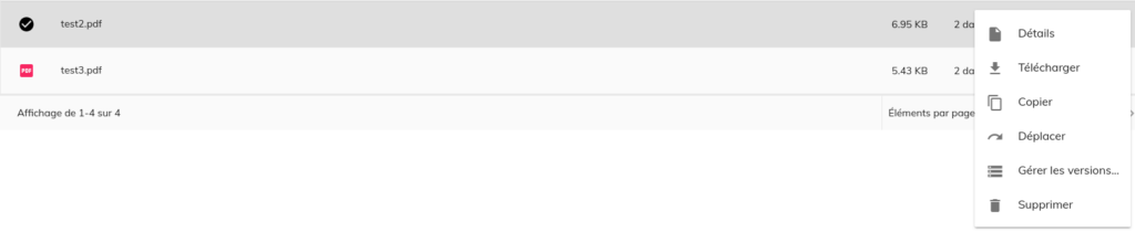 Quand l’utilisateur arrive sur le document qui l’intéresse, le volet d’options permet plusieurs actions : copier le document, le télécharger, le déplacer, le supprimer ou encore voir les différentes versions de ce document. Cette liste n’est pas exhaustive, d’autres actions sont à disposition mais n’ont pas été mise en place dans notre monture de test (le partage du document vers l’extérieur notamment).